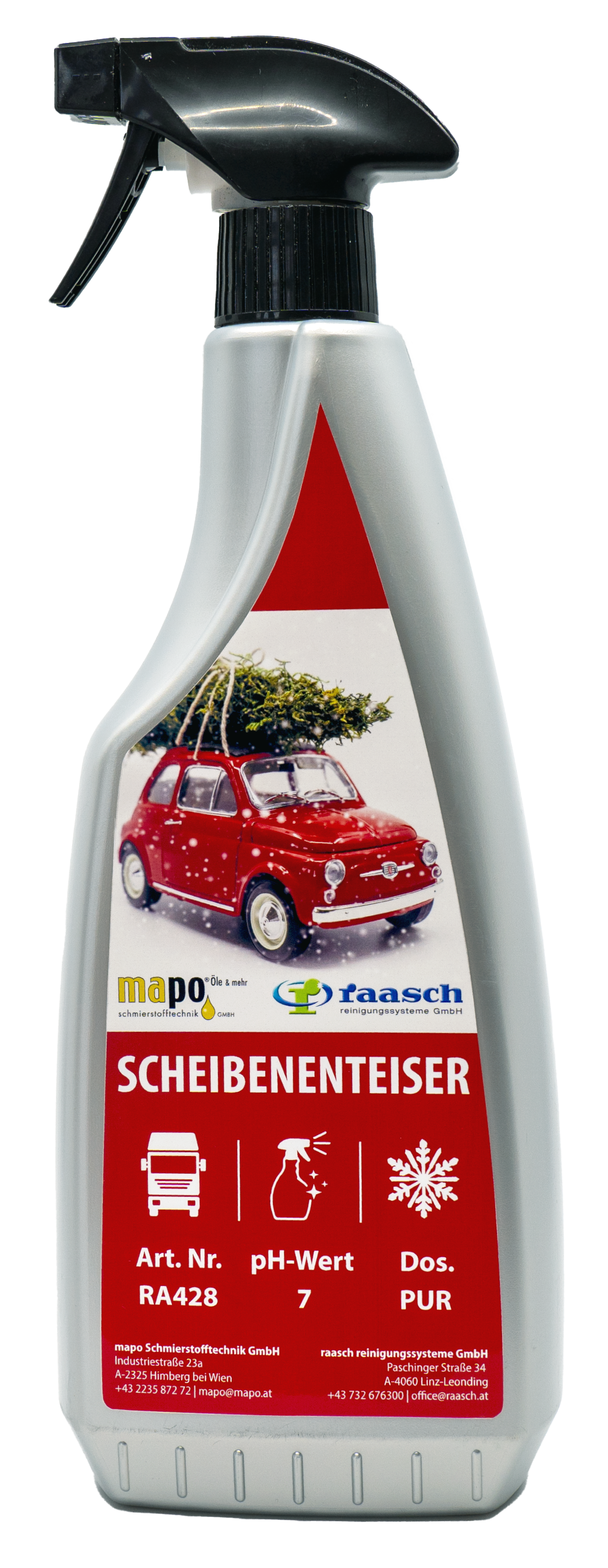 Losen Schnee und lockeres Eis mit dem Eisschaber bzw. Schneebesen entfernen. Sprühkopf öffnen und aus ca. 15 cm Entfernung von oben nach unten aufsprühen. pH-Wert 7 Dosierung: PUR